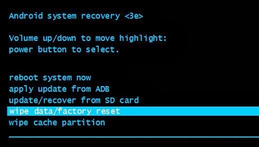 - من ضمن العديد من الخيارات التي ستظهر نختار Wipedata / Factoryreset ويمكن التنقل بين الاختيارات عن طريق زر رفع وخفض الصوت ولتأكيد الاختيار نضغط على زر الباور فهو يعمل بمثابة زر ok.